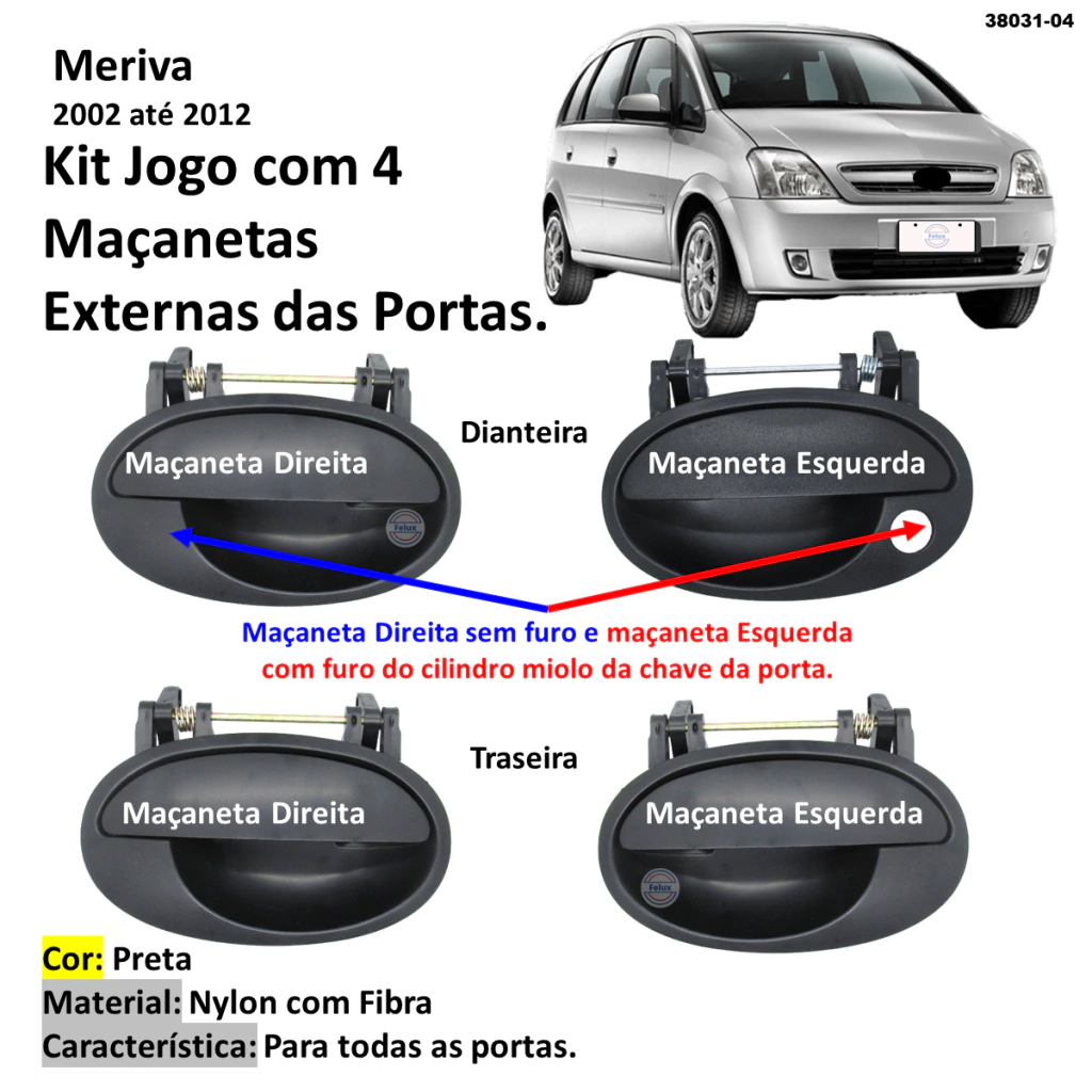 Produto: Kit Maçanetas Externa Cor: Preta Material: Nylon com fibra Característica: Kit Jogo com quatro 4 Maçanetas externas, a dianeira esquerda com furo para passagem do acionamento do cilindro lateral da porta e dianteira direita e as traseiras sem furo. A maçaneta NÃO acompanha as chaves e o cilindro de porta. Lado de Aplicação: Esquerdo (motorista) e Direito (passageiro) Local de Aplicação: Porta Dianteira e Traseira Aplicação Principal: Meriva Modelo: Serve apenas no modelo 4 Portas Montadora: Chevrolet Ano de aplicação: 2002-2012 Ano de aplicação corrida: 2002 2003 2004 2005 2006 2007 2008 2009 2010 2011 2012 Outras Aplicações: Aplicada nos veículos Chevrolet GM nas versões do Novo Corsa, Corsa Montana popular Corsão da segunda geração, fabricados entre 2002 até 2012, Montana Frente Corsa fabricado entre 2003 até 2010 e Meriva fabricada entre 2002 até 2012. Código FELUX: 3803104 Código Original: 93397227 + 93397229 + 93397228 (2x) / 3803104 Nomenclatura Equivalente: Puxador, Alça, Gatilho Atenção: Procure sempre um profissional especializado para a instalação da sua peça, assim você não corre o risco de perder a garantia por mau uso. Felux Autopeças - Mais de 20 anos de experiência no ramo automotivo. Você está procurando algum produto específico e não localizou? Entre em contato conosco! Agradecemos a visita em nosso anúncio!