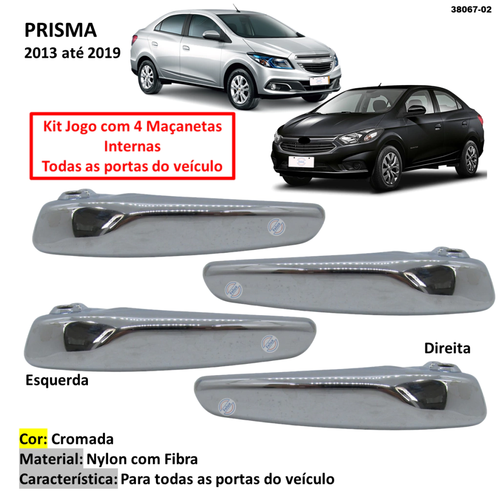 Aplicação Principal: Prisma Modelo: Serve apenas no modelo 4 Portas Montadora: Chevrolet Ano de aplicação: 2013-2019 Ano de aplicação corrida: 2013 2014 2015 2016 2017 2018 2019 Outras Aplicações: Aplicado em todos do Chevrolet GM Onix 2012 até 2019; Prisma 2013 até 2019; Joy 2019 até 2021; Joy Sedan 2019 até 2021; Cobalt 2011 até 2020 e Spin Após 2012. Código FELUX: 3806702 Código Original: 3806702 Nomenclatura Equivalente: Puxador, Alça, Gatilho, maçaneta interna de abertura de porta