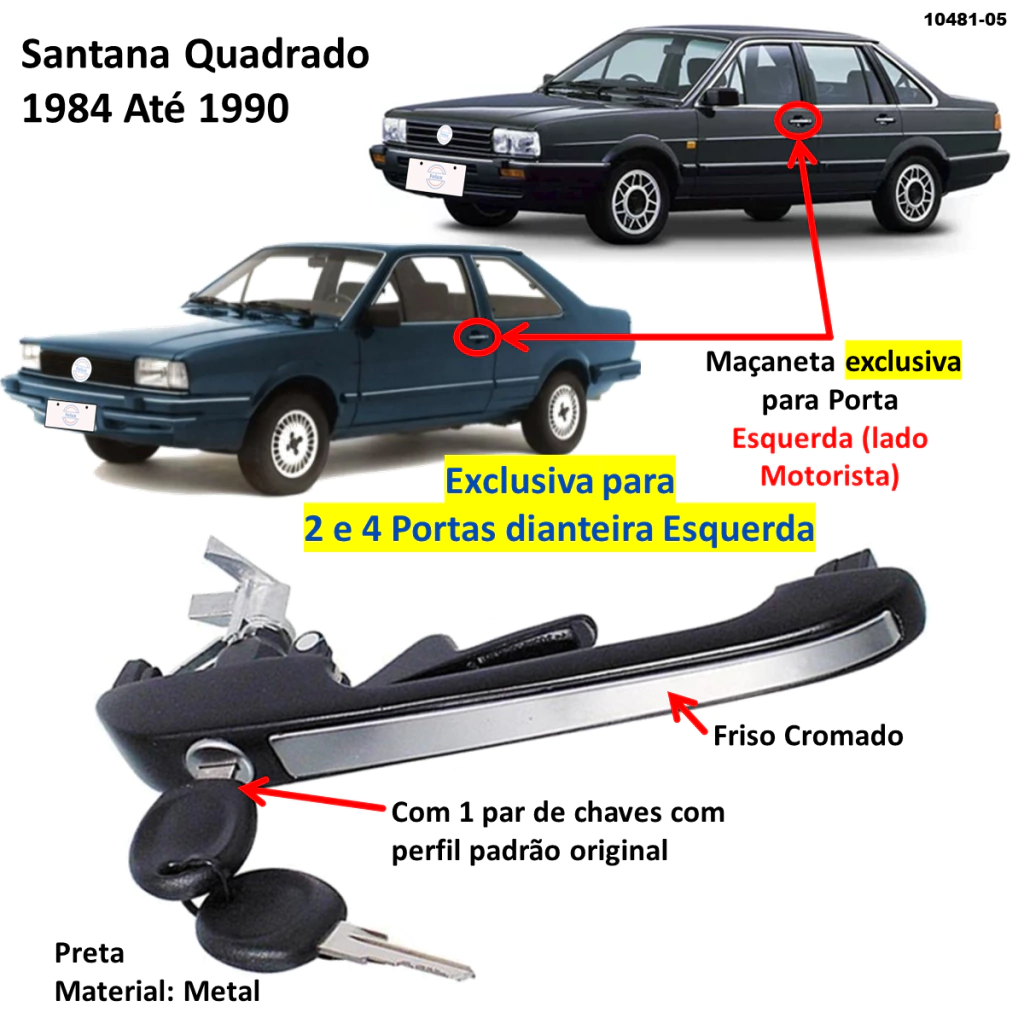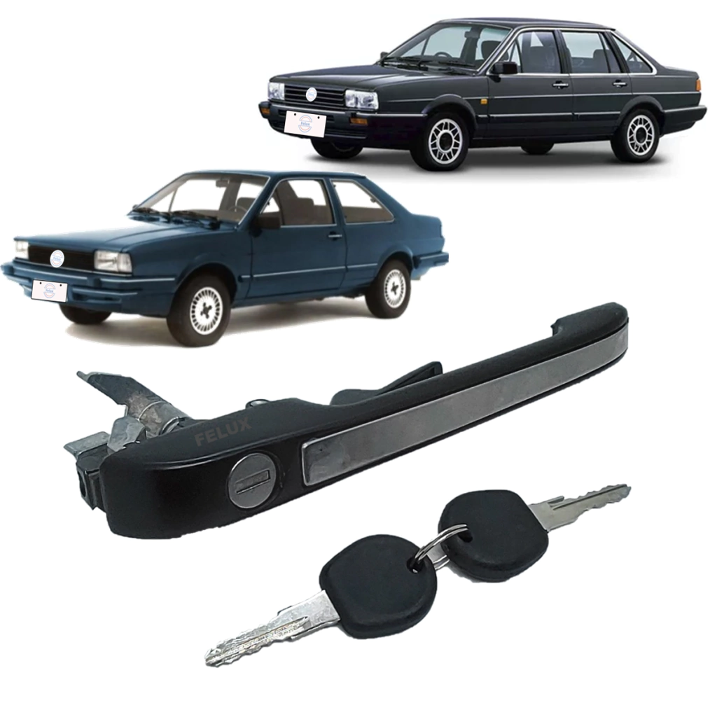 Produto: Maçaneta Externa com chave (1 unidade) Cor: Maçaneta Preta Material: Metal Característica: Friso Inox - Cromado Lado de Aplicação: Esquerdo (lado motorista) Outras Características: Acompanha um par de chaves e cilindro/miolo Aplicação Principal: Santana Quadrado Modelo: Serve em ambos modelos - 2 e 4 Portas Montadora: Volkswagen Ano de aplicação: 1984-1990 Ano de aplicação corrida: 1984 1985 1986 1987 1988 1989 1990 Outras Aplicações: Parati, Saveiro, Gol, Voyage, Santana, Quantum todos Versão Quadrada Código FELUX: 1048105 Código Original: 305.837.205.7 Nomenclatura Equivalente: Puxador, Alça, Gatilho Atenção: Procure sempre um profissional especializado para a instalação da sua peça, assim você não corre o risco de perder a garantia por mau uso. Felux Autopeças - Mais de 20 anos de experiência no ramo automotivo. Você está procurando algum produto específico e não localizou? Entre em contato conosco! Agradecemos a visita em nosso anúncio!