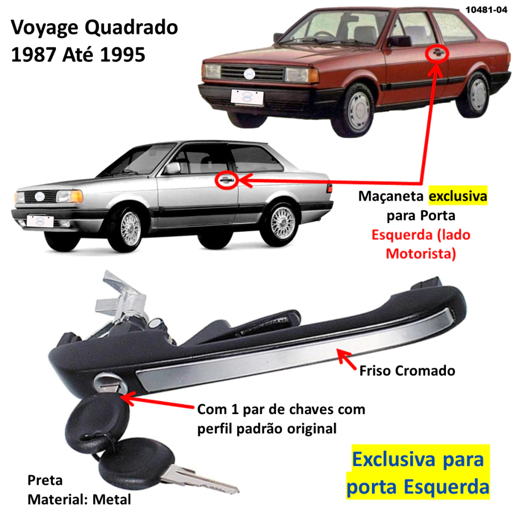 Produto: Maçaneta Externa com chave (1 unidade) Cor: Maçaneta Preta Material: Metal Característica: Friso Inox - Cromado Lado de Aplicação: Esquerdo (lado motorista) Outras Características: Acompanha um par de chaves e cilindro/miolo Aplicação Principal: Voyage Quadrado Modelo: Serve apenas no modelo 2 Portas Montadora: Volkswagen Ano de aplicação: 1987-1995 Ano de aplicação corrida: 1987 1988 1989 1990 1991 1992 1993 1994 1995 Outras Aplicações: Parati, Saveiro, Gol, Voyage, Santana, Quantum todos Versão Quadrada Código FELUX: 1048104 Código Original: 305.837.205.7 Nomenclatura Equivalente: Puxador, Alça, Gatilho Atenção: Procure sempre um profissional especializado para a instalação da sua peça, assim você não corre o risco de perder a garantia por mau uso. Felux Autopeças - Mais de 20 anos de experiência no ramo automotivo. Você está procurando algum produto específico e não localizou? Entre em contato conosco! Agradecemos a visita em nosso anúncio!