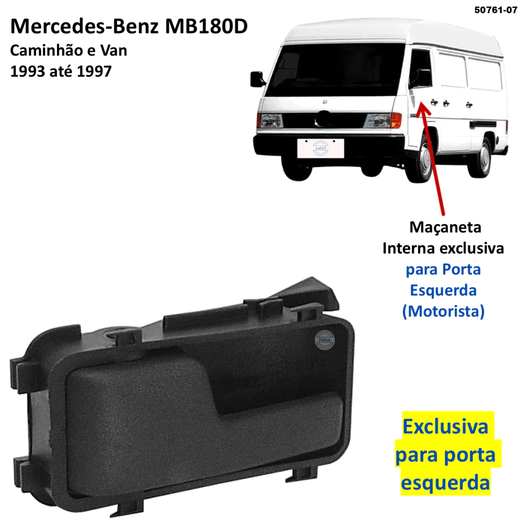 Produto: Maçaneta Interna Cor: Preta Material: Nylon com fibra Característica: Gatilho com base completa Lado de Aplicação: Esquerdo (motorista) Local de Aplicação: Porta Dianteira Outras Características: Maçaneta Interna com puxador fino, adaptada para a MB180D, montando e com o acionamento perfeito para o veículo. Aplicação Principal: Mercedes MB180D