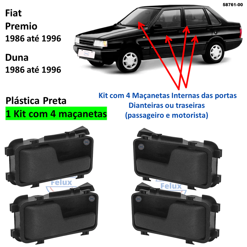 Produto: Maçaneta Interna (1 unidade) Cor: Preta Material: Nylon com fibra Característica: Gatilho com base completa Lado de Aplicação: Direito (lado passageiro) Local de Aplicação: Porta Dianteira e Traseira Outras Características: Maçaneta Interna com acabamento liso Aplicação Principal: Uno Quadrado Modelo: Serve em ambos modelos - 2 e 4 Portas Montadora: Fiat Ano de aplicação: 1984-2013 Ano de aplicação corrida: 1984 1985 1986 1987 1988 1989 1990 1991 1992 1993 1994 1995 1996 1997 1998 1999 2000 2001 2002 2003 2004 2005 2006 2007 2008 2009 2010 2011 2012 2013 Outras Aplicações: Uno Quadrado 1984 até 2013, Uno Mille 1990 até 2013, Premio ou Duna 1986 atè 1995, Elba 1985 até 1995, Fiorino Quadrada de 1988 até 2013. Código FELUX: 5076200 Código Original: 5961723 Nomenclatura Equivalente: Puxador, Alça, Gatilho Atenção: Procure sempre um profissional especializado para a instalação da sua peça, assim você não corre o risco de perder a garantia por mau uso.