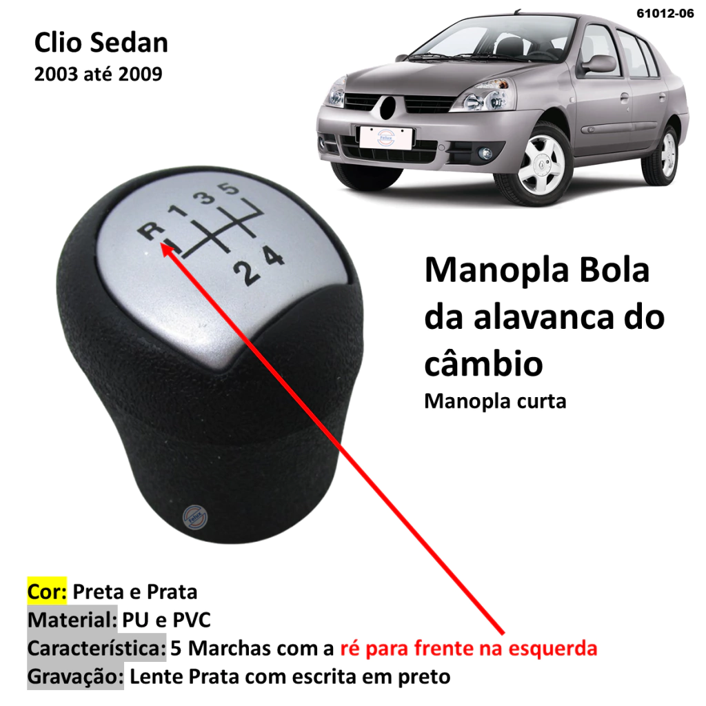 Aplicação Principal: Clio Sedan Montadora: Renault Ano de aplicação: 2003-2009 Ano de aplicação corrida: 2003 2004 2005 2006 2007 2008 2009 Outras Aplicações: Aplicado Originalmente nos veículos Clio e Scenic. Alavanca aplicada em diversos veículos Linha do Clio, com compatibilidade do cambio Renault. Código FELUX: 6101206 Código Original: FLX6101206 Nomenclatura Equivalente: Manopla, Bola, Puxador, Pegador, Manipulo.
