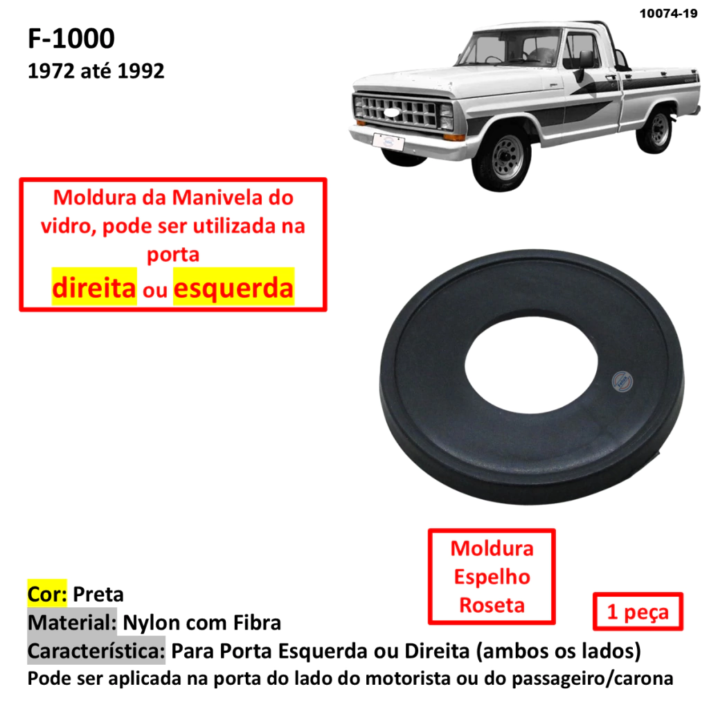 Produto: Moldura Espelho Roseta Calço Canopla Acabamento Cor: Preta Material: Nylon Característica: Aplicado como acabamento da manivela do vidro. Lado de Aplicação: Esquerdo (motorista) ou Direita (lado passageiro / carona) Local de Aplicação: Outras Características: Aplicação Principal: F1000 Modelo: Serve apenas no modelo Montadora: Ford Ano de aplicação: 1972-1992 Ano de aplicação corrida: 1972 1973 1974 1975 1976 1977 1978 1979 1980 1981 1982 1983 1984 1985 1986 1987 1988 1989 1990 1991 1992 Outras Aplicações: