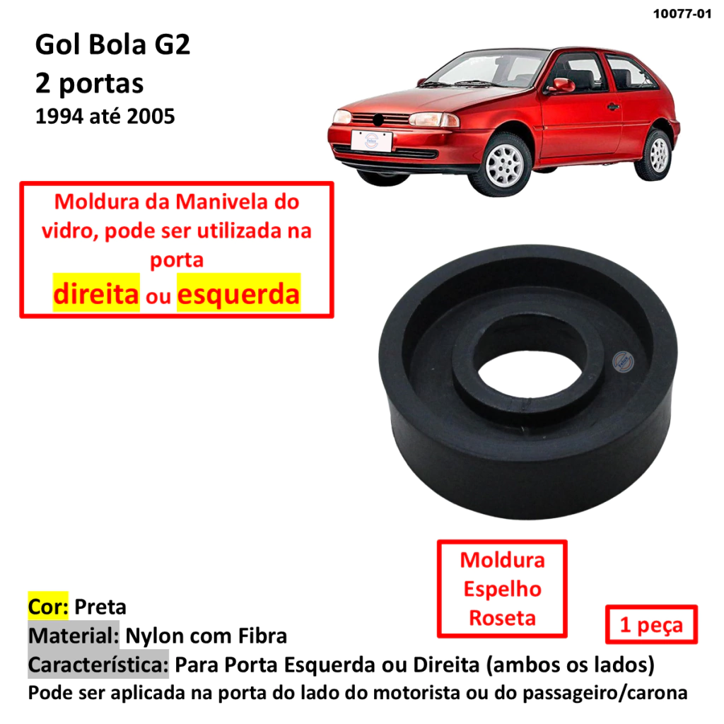 Produto: Moldura Espelho Roseta Calço Canopla Acabamento Cor: Preta Material: Nylon Característica: Aplicado como acabamento da manivela do vidro. Lado de Aplicação: Esquerdo (motorista) ou Direita (lado passageiro / carona) Local de Aplicação: Outras Características: Calço aplicado somente nas manivelas fixas por parafuso na máquina / levantador do vidro Aplicação Principal: Gol Bola G2 Modelo: Serve apenas no modelo 2 Portas Montadora: Volkswagen Ano de aplicação: 1994-2005 Ano de aplicação corrida: 1994 1995 1996 1997 1998 1999 2000 2001 2002 2003 2004 2005 Outras Aplicações: PRODUTO EXCLUSIVO PARA OS CARROS 2 PORTAS, NÃO PODE SER APLICADO NO CARRO 4 PORTAS.