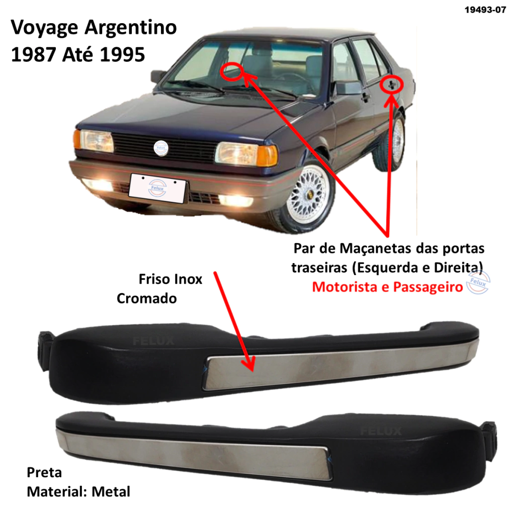 Produto: Par Maçanetas Externa sem chave sem furo Cor: Maçaneta Preta Material: Metal Característica: Friso Inox - Cromado Lado de Aplicação: Esquerdo (motorista) e Direito (passageiro) Local de Aplicação: Porta Traseira Outras Características: Todas as maçanetas sem chave, sem furo e sem cilindro miolo de abertura da porta. Sistema indicado para ser instalado com alarme de destravamento da porta, aumentando a segurança do veículo, sistema anti-furto (antifurto). Aplicação Principal: Voyage Argentino Modelo: Serve apenas no modelo 4 Portas Montadora: Volkswagen Ano de aplicação: 1987-1995 Ano de aplicação corrida: 1987 1988 1989 1990 1991 1992 1993 1994 1995 Outras Aplicações: Parati, Saveiro, Gol, Voyage, Santana, Quantum todos Versão Quadrada Código FELUX: 1949307 Código Original: 302.839.205.8-1049307 - 302.839.206.8-1049207 Nomenclatura Equivalente: Puxador, Alça, Gatilho Atenção: Procure sempre um profissional especializado para a instalação da sua peça, assim você não corre o risco de perder a garantia por mau uso. Felux Autopeças - Mais de 20 anos de experiência no ramo automotivo. Você está procurando algum produto específico e não localizou? Entre em contato conosco! Agradecemos a visita em nosso anúncio!