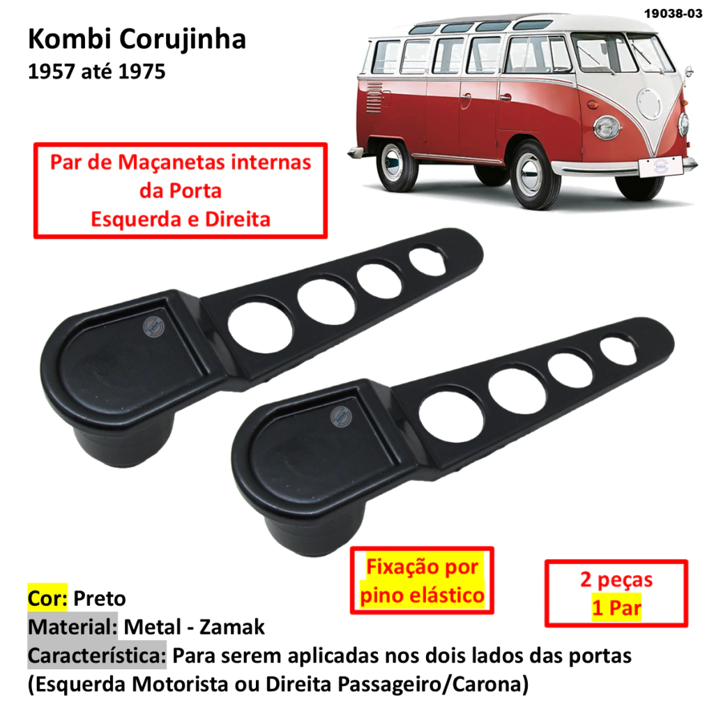 Aplicação Principal: Kombi Modelo: Serve apenas no modelo 2 Portas Montadora: Volkswagen Ano de aplicação: 1957-1975 Ano de aplicação corrida: 1957 1958 1959 1960 1961 1962 1963 1964 1965 1966 1967 1968 1969 1970 1971 1972 1973 1974 1975 Outras Aplicações: Fusca, Kombi, Karmann-Ghia