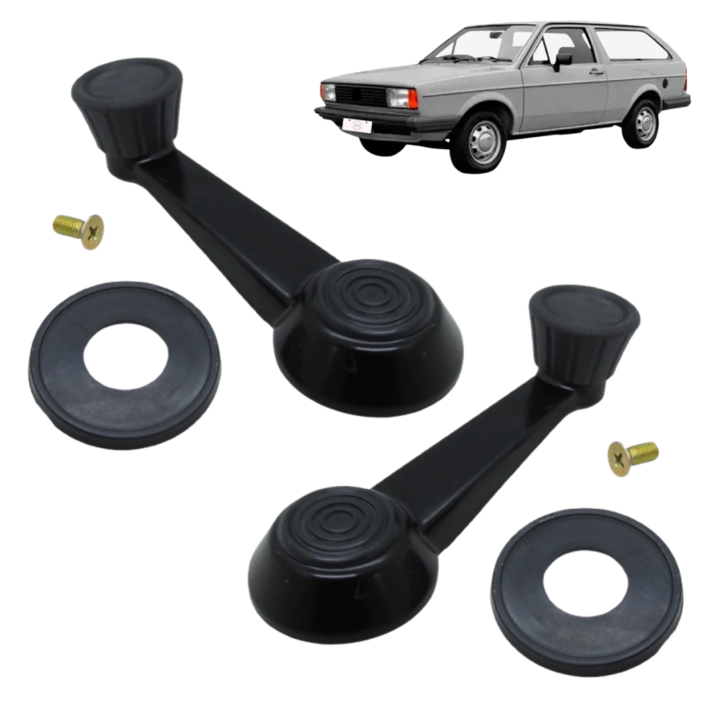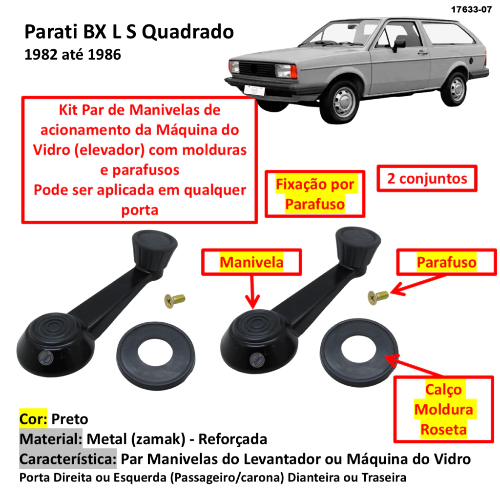 Outras Características: Produto composto por kit de par de Manivelas, Calços tipo roseta moldura da base da manivela e parafusos de fixação do conjunto. Aplicação Principal: Parati BX L S