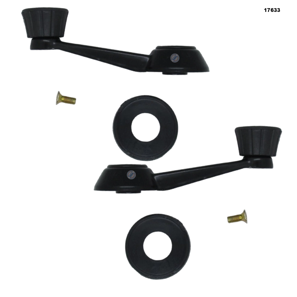 Produto: Par Manivelas Da Máquina Do Vidro com espelho moldura e Parafuso Cor: Preta Material: Estrutura de Metal (Ferro - Zamak) Característica: Fixação por parafuso Lado de Aplicação: Esquerdo (lado motorista) e Direita (lado passageiro / carona)