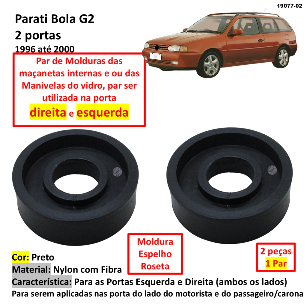 Produto: Par Molduras Espelhos Rosetas Calços Canoplas Acabamentos Cor: Preta Material: Nylon Característica: Par de molduras aplicadas como acabamento das manivelas do vidro. Lado de Aplicação: Esquerdo (motorista) e Direita (lado passageiro / carona) Local de Aplicação: Outras Características: Calço aplicado somente nas manivelas fixas por parafuso na máquina / levantador do vidro Aplicação Principal: Parati Bola G2 Modelo: Serve apenas no modelo 2 Portas Montadora: Volkswagen Ano de aplicação: 1997-2005 Ano de aplicação corrida: 1997 1998 1999 2000 2001 2002 2003 2004 2005 Outras Aplicações: PRODUTO EXCLUSIVO PARA OS CARROS 2 PORTAS, NÃO PODE SER APLICADO NO CARRO 4 PORTAS.